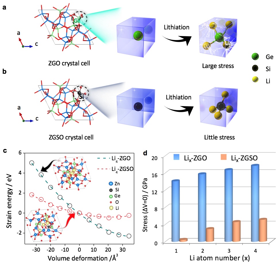 杨金虎教授课题组低应力高性能电池材料研究取得系列进展 当前快速发展的移动电子设备、电动汽车产业和未来智能电网战略,要求发展高性能电池技术作为支撑。然而,电池在充放电过程中,电极材料会产生巨大体变化和结构应力,导致电极材料严重粉碎,造成材料内部、材料与电极之间失去电接触,引起电池性能的全面劣化。针对上述问题,我院杨金虎教授课题组近期通过合理的电极结构设计,发展了一系列低应力、结构稳定的高性能电极材料,实现了电池性能的显著提升。系列研究成果分别发表在国际能源期刊《Advanced Energy Materials》、《Nano Energy》和Cell Press旗下的期刊《iScience》上。 在不久前提出单组份电极材料在纳米尺度上的多壳层协同结构保持和应力缓解机制(Advanced Materials, 2017, 29, 1701494)的基础上,该课题组进而提出了原子尺度的应力缓解策略。利用课题组之前发展的定点取代方法(ACS Nano, 2016, 10, 7882-7891),研究人员利用Si原子定点取代Zn2GeO4(ZGO)纳米线中的Ge原子,成功合成了Zn2(GeO4)0.8(SiO4)0.2(ZGSO)纳米线,所合成的ZGSO作为锂离子电池负极材料时,展现出了较高的比容量和突出的长循环性能。通过非原位XPS分析和密度泛函理论(DFT)嵌锂应力计算,发现Si原子取代的纳米线不仅具有更高的反应活性和理论储锂容量,其独特的原子结构还更有利于缓解锂化过程中所产生的应力,从而保持完整的结构,实现高容量和超长循环寿命。该研究成果日前发表在《Advanced Energy Materials》上(Adv. Energy Mater. 2018, 8, 1702805;影响因子16.72),课题组博生研究生贺婷是第一作者。