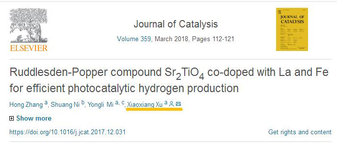 此外,在另一项基于Sr2TiO4光催化产氢研究中,徐晓翔教授和硕士研究生张红发现了La/Fe掺杂可以拓展Sr2TiO4的可见光吸收范围,有效实现了可见光产氢的效果,该研究成果以“Ruddlesden-Popper compound Sr2TiO4co-doped with La and Fe for efficient photocatalytic hydrogen production”为题发表在催化类主流期刊《Journal of Catalysis》上(DOI: org/10.1016/j.jcat.2017.12.031).