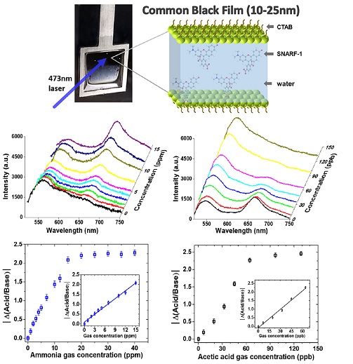 我院张鲁凝教授课题组长期致力于发展微纳米尺度下光谱分析方法,结合物理、材料、生物学的手段和方法,尝试利用光子晶体、纳米粒子、生物膜结合超分辨和光镊操控,实现在纳米尺度和单分子水平下高效率、定向、定点地光子传送和采集。日前,该课题组利用物理领域常见的普通黑皂膜实现了百万分之一浓度(ppm)氨气以及十亿分之一浓度(ppb)的乙酸检测。黑皂膜是厚度低于100纳米的肥皂膜,因其不发生光学干涉而呈现黑色。课题组研究人员使用的皂膜厚度大约为10-25纳米,因此具有极高的比表面积,达到~1000平方米每克,与碳纳米管接近。该方法巧妙地利用普通黑皂膜的以上特点,使其高效地吸附氨气或者乙酸气相分子,利用其中所包含的荧光酸碱指示剂测量吸附气体导致的pH变化。实验结果表明荧光信号与气体浓度在一定范围内呈线性响应。据此原理,可以利用黑皂膜作为一个平台,在其中利用酸碱反应、络合反应、氧化还原反应等过程实现高灵敏度的荧光探测方法,对气相分子进行检测。课题组正在研究利用此方法实现对甲醛、二氧化硫等气体的检测并已取得初步进展。 有关成果以“Sensing Parts per Million Level Ammonia and Parts per Billion Level Acetic Acid in the Gas Phase by Common Black Film with a Fluorescent pH Probe”为题发表在分析化学国际知名期刊Analytical Chemistry上(DOI: 10.1021/acs.analchem.7b04347),课题组博士生付静妮是论文第一作者,张鲁凝教授为通讯作者。该项目得到科技部重大仪器开发专项(2012YQ22011303)、自然科学基金(21275107)以及中央高校基本科研业务费专项资金(1380219126)的合作支持。 |