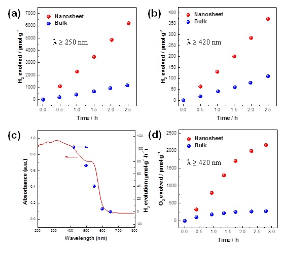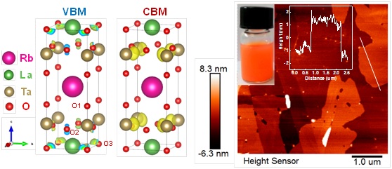 近日,该课题组研究了Dion-Jacobson型层状钙钛矿材料RbLaTa2O7,通过DFT理论计算证明该材料具有特殊的二维电荷传导特征,即电荷的传输被限制在LaTa2O7—钙钛矿层,而层间的电荷传输被禁止了。因此,每层钙钛矿可以作为独立的单元参与光催化反应。根据这一特征,课题组利用离子交换逐步剥离的方法将体相RbLaTa2O7剥离为单层的钙钛矿层LaTa2O7—,极大地提高了材料的比表面积。在这种单层的钙钛矿结构中,所有的光生电荷都直接在表面生成,避免了体相的传输。与此同时,课题组利用氮掺杂的手段,获得了可见光响应的单层钙钛矿纳米片LaTa2O6.77N0.15—(光吸收边达到600纳米)。这种钙钛矿纳米片表现出优异的光催化分解水活性,在可见光激发下还原水制氢和制氧的表观量子产率达到了1.29%和3.27%,远高于体相材料。