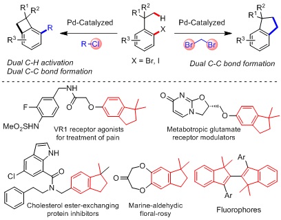 该研究以卤代芳烃为起始物,以过渡金属钯为催化剂,经过C(sp3)-H键活化形成环钯络合物,该环钯络合物可以与通常反应活性很低的卤代烷烃反应,经历一系列新颖巧妙的转变,得到了复杂的二氢化茚和苯并四元环产物。该研究不仅发展了一新颖的有机反应,合成的产物在生物医药、香料、和材料学上还有着重要应用。该研究成果发表于化学国际权威期刊Angew. Chem. Int. Ed.上(DOI: 10.1002/anie.201706418,“Pd-Catalyzed Alkylation with Alkyl Halides by C(sp3)-H Activation”)。 上述研究工作得到国家自然科学基金委经费支持(21372176)。 |