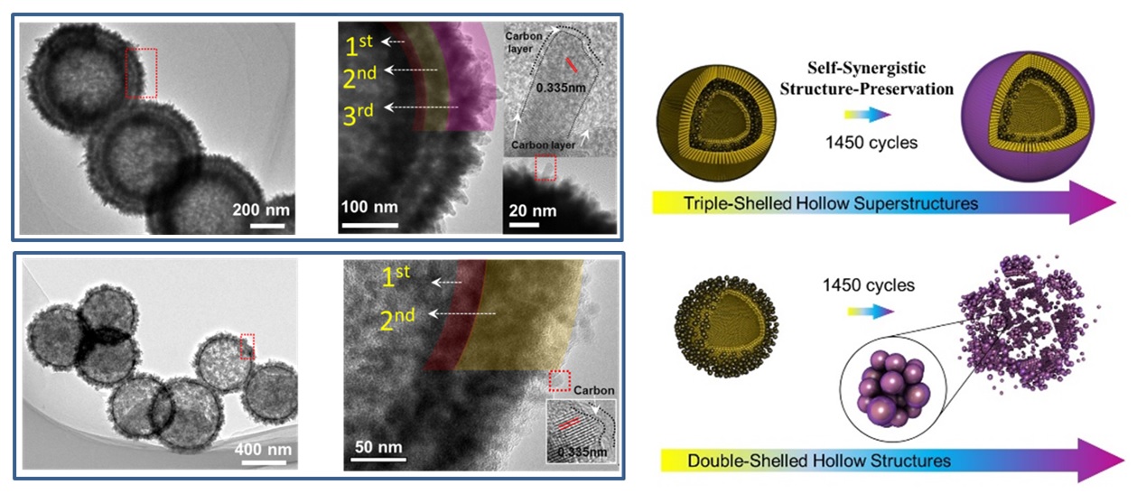 杨金虎教授课题组锂电低碳负极材料抗粉化研究取得重要进展 为开发实用、高能的锂离子电池开辟了新途径 锂离子电池作为目前主要的储能技术之一,为新兴的便携式电子设备和电动汽车提供主要动力。为了满足市场需求,开发兼具长循环寿命和高功率的高能量密度锂离子电池迫在眉睫。然而,锂离子电池负极尤其是高容量负极材料,在锂化/去锂化过程中伴随巨大体积膨胀/收缩变化,引起材料的严重粉碎,导致电池的不可逆容量损失,同时也使得电池在循环性能和倍率性能上的严重劣化。为了解决电极粉化的问题,当前大多数研究中都将机械性能优良、导电性好的石墨碳作为负极材料的柔性基体。但是,石墨碳(~372 mAh g-1)的理论容量较低,高含量碳的引入会大大降低电池容量和能量密度,从而极大地限制了其在电动汽车中的实际应用。因此,降低负极材料中的碳含量是提高能量密度的一个有效方法。然而,构筑低碳含量、同时具有抗粉化性能的负极材料极具挑战,我院杨金虎教授课题组致力于锂离子电池的开发应用,积极应对挑战,攻关研究。近日,该课题组与复旦大学的彭慧胜教授密切合作,在锂离子电池负极材料抗粉化研究中取得了重要进展。相关研究成果以“Antipulverization Electrode Based on Low-Carbon Triple-Shelled Superstructures for Lithium-Ion Batteries”为题在线发表在国际材料科学著名期刊《Advanced Materials》(2017, DOI: 10.1002/adma.201701494,影响因子为19.79)上,该课题组博士研究生祖连海为论文第一作者。