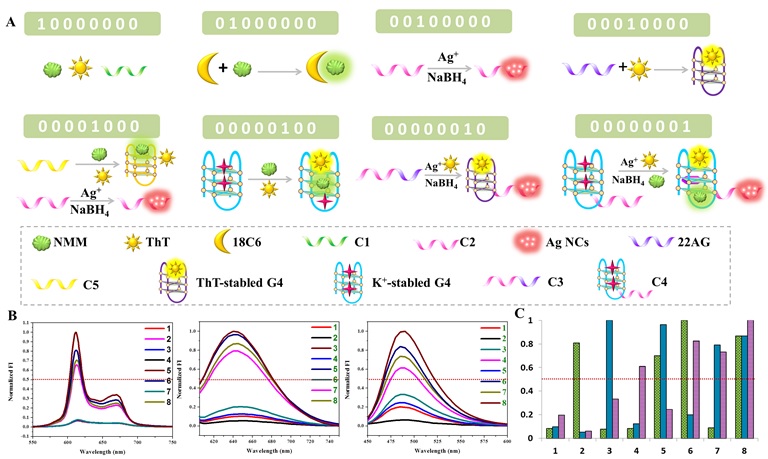 因为在“分子机器的设计和合成”方面的突出贡献,来自美国、法国和荷兰的三位科学家被授予2016年诺贝尔化学奖,“分子机器”这个远离人们日常生活的名词自此进入了公众视野。这些机器可谓是“最小机器”,只有人类头发的千分之一大小。分子机器其实是个颇为形象的称呼,是将宏观机器的概念引申至分子水平,指在合适的外界刺激下,可以执行类似机器运动的独立分子或分子组装体。分子机器包括分子开关、分子逻辑门、分子阀门、分子转轮、分子泵等一系列分子器件。我校yl9193永利集团石硕教授、姚天明教授课题组长期致力于分子机器的研究,取得了一系列重要的进展,未来将有助于疾病的诊断和治愈。 日前,基于DNA的构象变化,该课题组利用G-四链体与纳米银簇的特色发光,成功构建了编码器、解码器、多路复用器、多路分解器、奇偶数区分器等多个分子器件。这些分子器件将在相关疾病的诊断和治疗中表现巨大潜力,比如多路复用器可用于肝炎的诊断,它能有效区分乙肝患者及乙肝病毒携带者。相关研究成果“Integration of G-quadruplex and DNA-templated Ag NCs for Nonarithmetic Information Processing”发表于国际知名期刊Chemical Science(2017,DOI: 10.1039/C7SC00361G, IF=9.144)上。论文第一作者为课题组博士研究生高如如,她曾获博士研究生国家奖学金、永利集团优秀学生干部、永利集团优秀学生、yl9193永利集团“学术先锋”等奖项。石硕教授和姚天明教授为该论文的共同通讯作者。