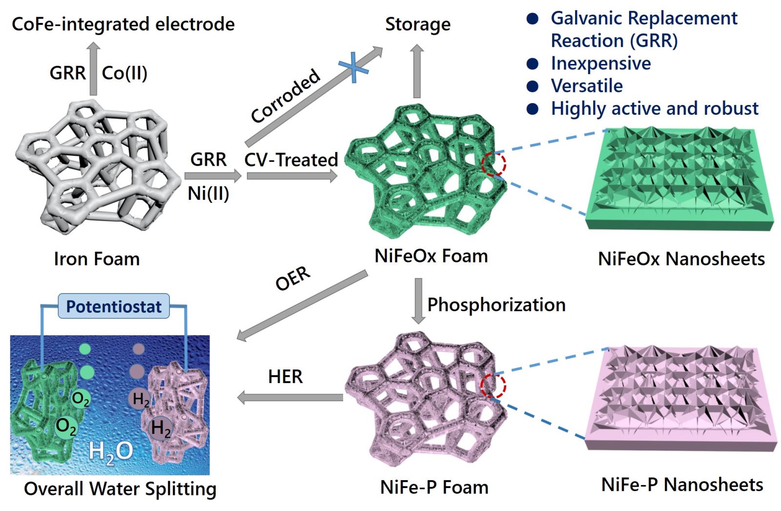 在新能源的研究开发中,氢气由于具有燃烧热值高、产物无污染和利用形式多样化等诸多优点而广受关注。与蒸汽甲烷转化法和水煤气法相比,电解法以水为原料,是一种清洁、可持续的大规模制备氢气的方法。在电解水反应中,水氧化析氧半反应相对于水还原析氢半反应无论在热力学或是动力学上都具有较大的难度,成为整个水分解体系能量转化效率的瓶颈,增加了电解水的能耗。开发基于廉价第一过渡系金属的水氧化催化剂是目前水氧化催化研究的一个重要课题。镍-铁共掺杂电催化剂由于镍-铁的协同效应,其催化性能较单金属基催化剂大大增强,是目前最有应用前景的水氧化电催化剂之一。 近日,我院陈作锋教授课题组报道了一种利用自发的电置换反应(Galvanic Replacement Reaction, GRR)制备具有三维纳米片结构的镍-铁基催化剂电极的新方法(见下图)。该方法利用不同金属间的电化学势差作为反应驱动力,无需消耗任何能量,制备方法简单。该催化剂电极具有特殊的三维纳米片结构,且无需使用粘合剂,表现出很高的水氧化电催化性能和稳定性,在1 M的KOH溶液中电流密度达到1000 mA/cm2只需要300 mV的过电位。这种方法具有很好的拓展性,同样可适用于制备钴-铁甚至镍-钴-铁三元电极。对所制备镍-铁电极进行磷化,可进一步制备具有良好催化性能的镍-铁磷化物产氢催化剂。该二元金属磷化物与氧化物所组装的两电极全反应电解装置表现出良好的电催化分解水的性能。该成果以“Hierarchically Structured 3D Integrated Electrodes by Galvanic Replacement Reaction for Highly Efficient Water Splitting” (http://dx.doi.org/10.1002/aenm.201700107)为题发表在国际材料类知名期刊《Advanced Energy Materials》(影响因子15.2)。课题组博士研究生汪建营为论文第一作者。