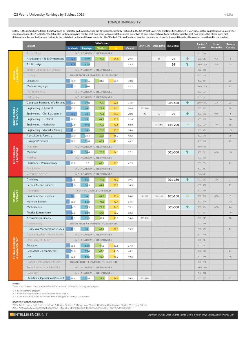 日前,英国QS发布了第六版《QS世界大学学科排名》,我校化学学科世界排名进入前400名(居于301-350区间),国内排名第27位。 3月22日,被视作“全球三大大学排名”之一的英国QS发布了第六版《QS世界大学学科排名》,我校建筑与建成环境学科世界排名第22,土木与结构工程学科世界排名第29,国内均排名第2;我校艺术与设计学科世界排名第34,国内排名第3。此外,我校另有环境科学(101-150),机械、航空航天与制造工程(151-200),医学(301-350),化学(301-350),数学(301-350),计算机与信息系统(351-400)等学科进入全球前400名。