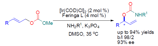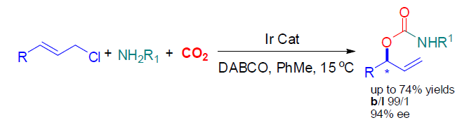 深入研究表明: 通过调控反应条件,CO2可以直接进行铱催化下不对称烯丙基化反应,从而合成了光学活性的胺基甲酸酯化合物。该工作“高选择性、经济、绿色,发表在英国皇家化学学会的《化学通讯》期刊上(Chemical Communications2014,50, 4455-4458; IF: 6.83)。CO2也可以直接实现钯催化下与胺、非对称烯丙基氯底物的串链反应,从而实现高区域选择性地合成胺基甲酸酯化合物《欧洲有机化学》期刊(Eur. J.Org. Chem.2015,15, 5925-5928; IF: 3.06)。