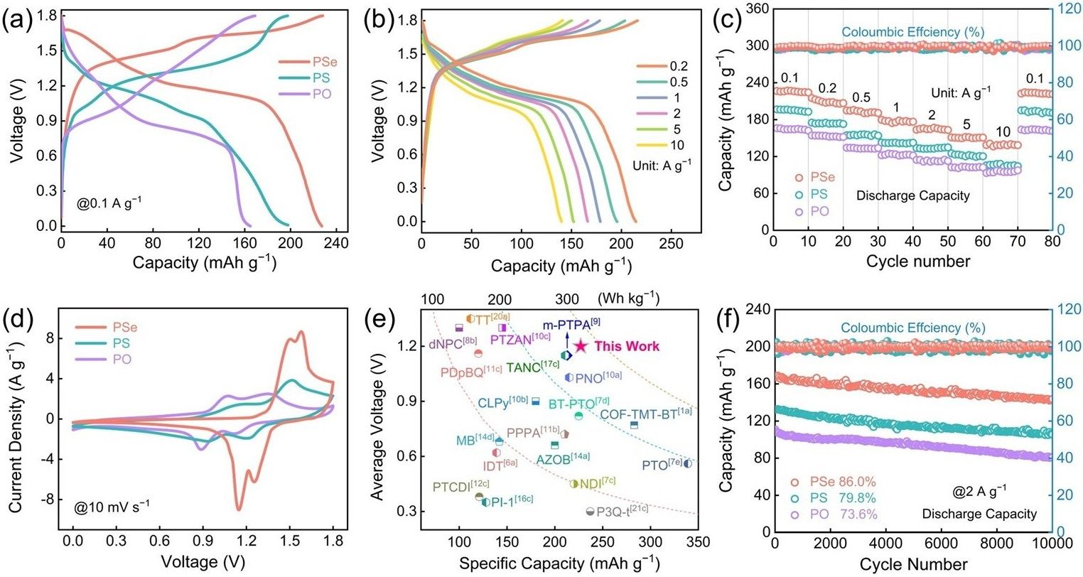 电化学性能研究表明:PSe用作水系锌-有机电池正极材料时,表现出高比容量(227 mAh g−1@0.1 A g−1)、高活性位点利用率(99.2%)和优异的循环稳定性(10,000次充放电后容量保持率为86.0%)。