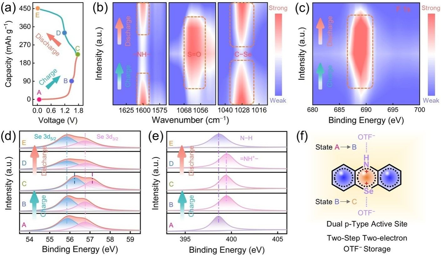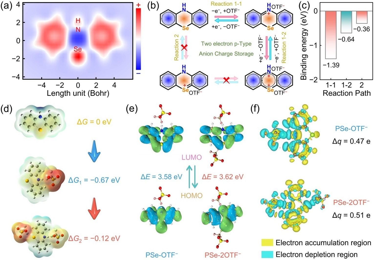 理论计算表明,PSe的亚胺和硒位点与CF3SO3间存在强相互作用,稳定的两步两电子阴离子共配位促进电极/电解质界面电荷累积,显著提高了电荷存储容量。