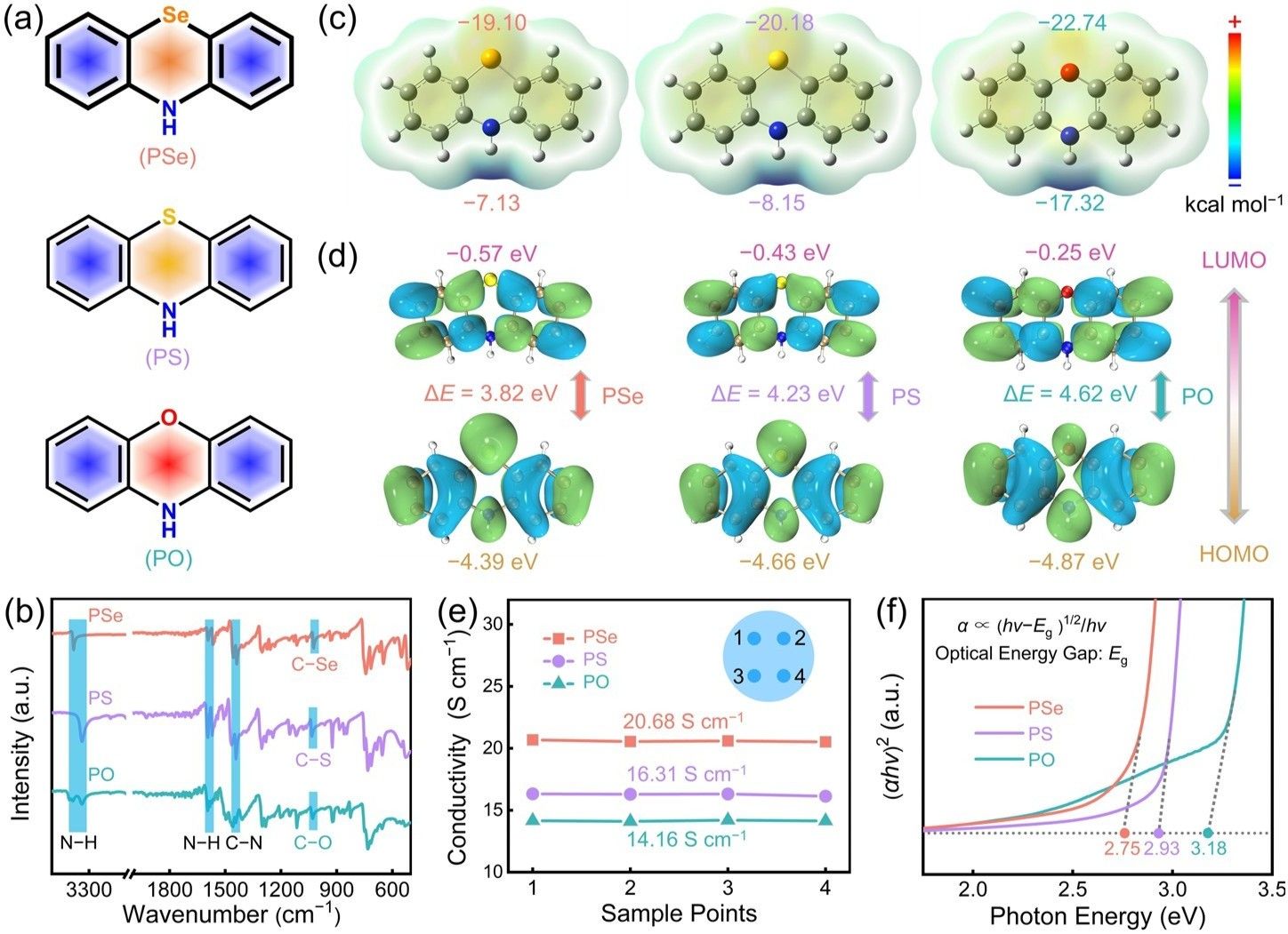 实验表征和理论计算表明:随着硫族电负性的降低(O>S>Se),吩硒嗪PSe)释放出最强的配位活性、最低的能带间隙和最优的电导率,有助于加快电子转移动力学和电极氧化还原速率。