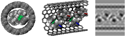 由于此类复合物普遍缺乏结晶性,且有机物分子在电子束条件下易发生诱导聚合反应,故不能使用常规X射线或电子衍射直接探明客体分子结构细节。故而X射线吸收精细结构(XAFS)及X射线光电子能谱学(XPS)被用于证明内包后DyCp3分子的完整性。并且使用密度泛函理论(DFT)推测了DyCp3分子在SWCNT内部可能的排布结构。内包后DyCp3分子的磁各向异性由完全活性空间自洽场(CASSCF)计算得出。