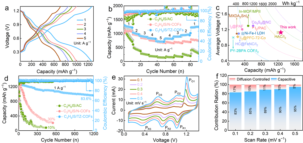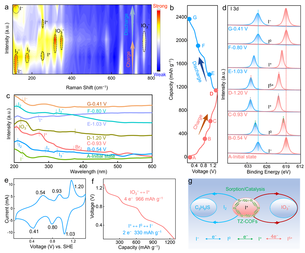 电化学研究表明:组装的Zn||TZ-COFs/C3H9IS电池,表现出高容量(1296 mAh g−1)、高能量密度(1464 Wh kg−1)和高的碘转化效率(97%)。