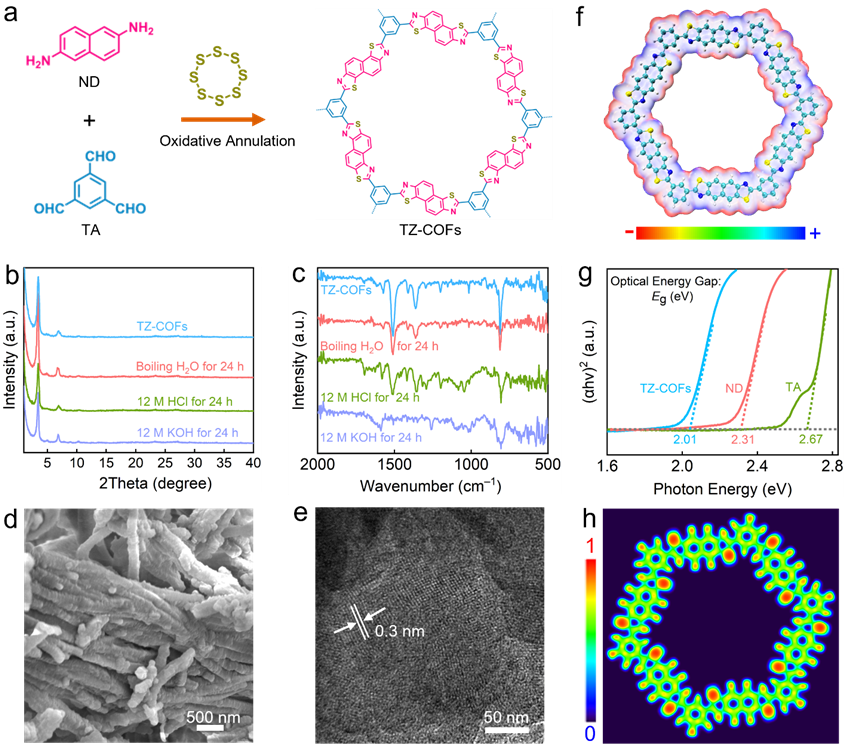 实验表征和理论计算表明:选择均苯三甲醛和2, 6-萘二胺为反应原料,在温和条件下与硫发生反应,成功合成了噻唑基共价有机框架(TZ-COFs),其展示出低能带间隙、高导电性和稳定性,有助于捕获碘物种并加速碘的氧化还原反应动力学。
