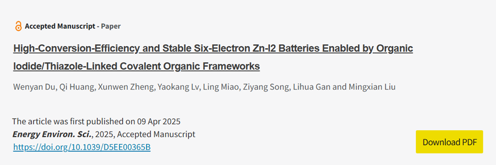 刘明贤教授团队设计高转化效率和稳定六电子碘转化的锌碘电池,研究成果发表于《能源与环境科学》