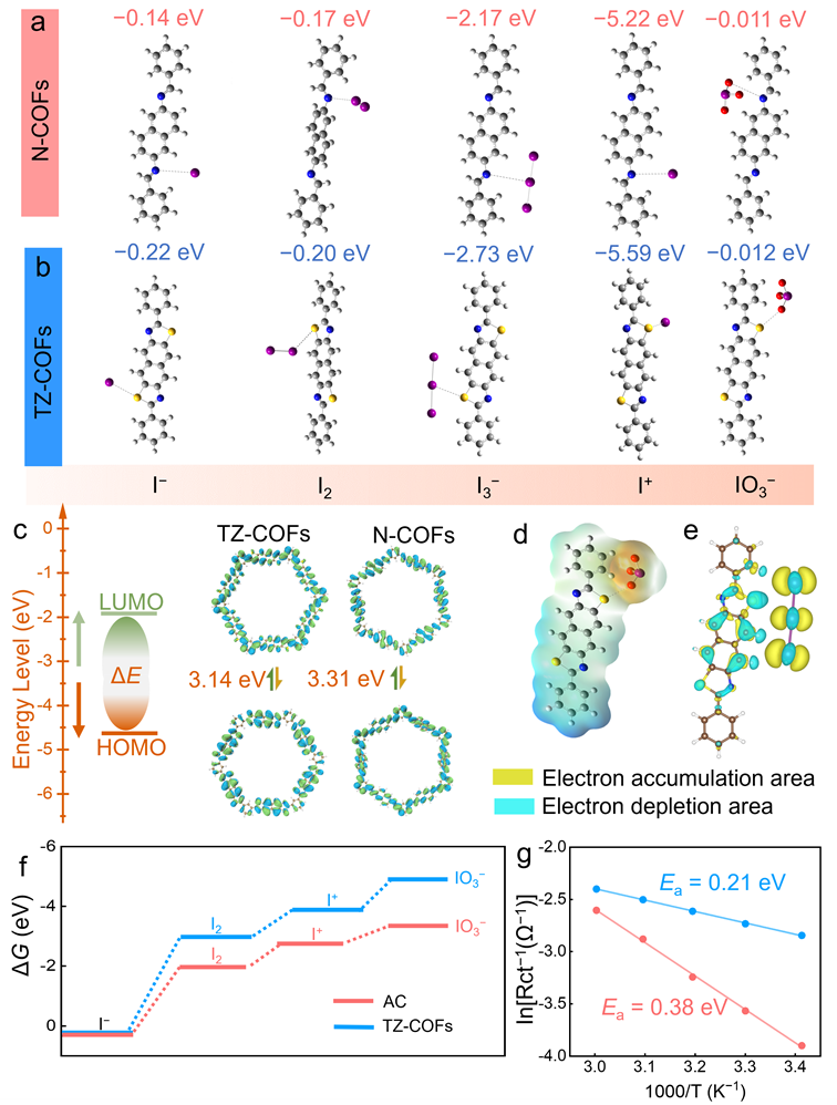 理论计算和差分电荷表明含有噻唑基活性位点的TZ-COFs与碘物种之间具有强的化学吸附作用,TZ-COFsC=N/C−S基团显著降低了碘转化反应活化能,催化高转化效率和稳定六电子(I/I2/I+/IO3)碘转化反应,该研究为高性能锌碘电池设计提供了新的思路