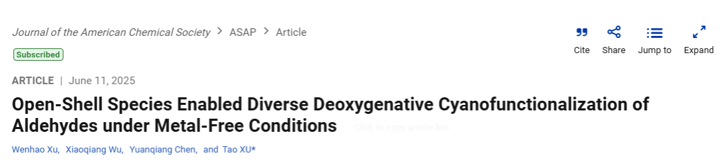 近日,徐涛课题组基于前期开发的醇去氧自由基化方法(Angew. Chem., Int. Ed. 2024, 63, e202401575)基础上,创新性地发展了一种无金属参与的光介导醛的去氧氰官能团化反应,相关研究成果发表于化学领域国际知名学术期刊《美国化学会志》(Journal of the American Chemical Society)。