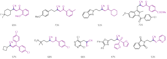 该反应条件简洁温和,官能团兼容性好,可以实现传统反应中难以实现的醛去氧氰双官能团化反应,得到一系列醛去氧氰烷酮化、氰烯基化、氰烯丙基化、氰卤化、氰膦化、和氰硫化的产物。