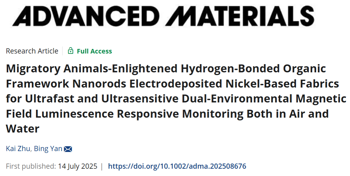 过去十年间,基于电学的磁传感器,如巨磁阻、隧道磁阻、各向异性磁阻、巨磁阻抗和霍尔效应传感器,已得到广泛报道。但其实际应用受到多种缺陷的限制,包括复杂的电路设计、寄生效应、信号串扰以及高制造成本。作为替代方案,基于发光传感机制的FBLMS代表了另一种有前途的方法,但此类研究鲜有报道。因此,开发低成本、双环境通用、极度灵敏且具备卓越的灵活性的FBLMS,仍面临重大挑战。鉴于此,迫切需要探索磁传感器的新概念和模型。基于HOFs的柔性复合薄膜被认为是卓越的选材对象。我院闫冰教授团队近期将迁徙动物磁导航能力巧妙地融合于HOFs基柔性器件之中,制备出超快及超灵敏的空气-水下双环境磁场传感器,并应用于水下磁无线通信、运动感知和空气-水下双环境磁智能实时监测,相关成果以“Migratory Animals-Enlightened Hydrogen-Bonded Organic Framework Nanorods Electrodeposited Nickel-Based Fabrics for Ultrafast and Ultrasensitive Dual-Environmental Magnetic Field Luminescence Responsive Monitoring Both in Air and Water”为题在线发表于化学、材料顶级期刊Advanced Materials上。