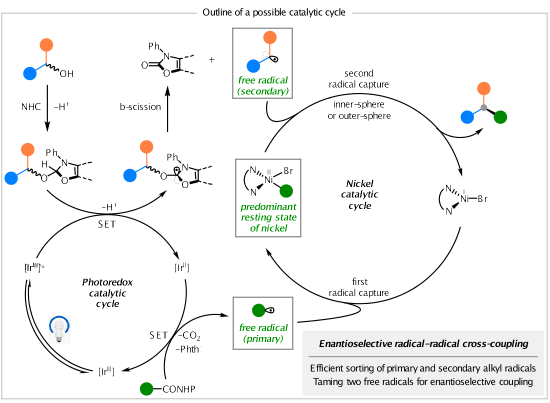在最优条件下,反应具有良好的底物普适性和官能团耐受性。作者通过一锅法反应、克级反应、偶联产物的转化和天然产物的合成展示了该方法的实用性。作者还对反应机理进行了较为深入的探究,提出了可能的催化循环。在碱的作用下,烷基醇和NHC(N-杂环卡宾盐)反应生成NHC醇的加合物;激发态的光催化剂[IrIII]*将NHC醇的加合物单电子氧化,生成阳离子自由基物种,接着经历去质子化和β裂解过程生成二级烷基自由基;被还原猝灭的光催化剂[IrII]具有较强的还原性,可以将NHP酯还原为一级烷基自由基;在镍催化循环中,一价镍溴中间体首先与一级烷基自由基结合生成二价烷基镍溴中间体;随后与二级烷基自由基反应(内球机制或外球机制)生成偶联产物,同时再生一价镍溴中间体,完成催化循环。