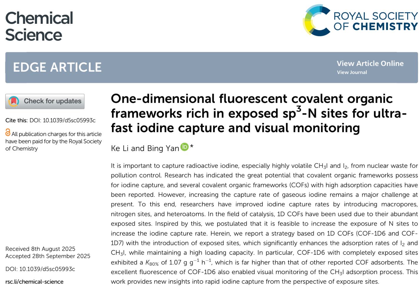 随着能源危机的临近,核能作为低碳能源,在摆脱污染性化石燃料能源的过程中提供了重要的过渡技术。放射性碘作为裂变产物,以I₂、CH₃I和I₃⁻的形式存在于空气和水中,其高放射性、生物相容性和长半衰期特性对人类健康构成严重威胁。同时,碘元素通常以高挥发性的I₂和CH₃I形态存在,可通过呼吸途径轻易进入人体且难以捕获。因此,放射性碘的管理及放射性废物中气态碘的高效处理至关重要。相较于传统的溶液洗涤法,吸附剂法因其高效性备受关注。目前已开发出多种吸附剂,如银基纳米材料、改性生物炭、金属氧簇、沸石、气凝胶、金属有机框架(MOFs)、氢键有机框架(HOFs)及共价有机框架(COFs)。然而,考虑到贵金属成本及金属离子潜在二次污染风险,设计富含氮活性位点且具有高吸附性能的非金属多孔材料开启了碘捕获研究的新纪元。
