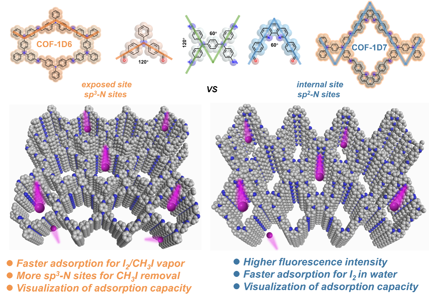 COF-1D6与COF-1D7的合成策略及结构骨架,I2/CH3I(紫色球)传输模式示意图