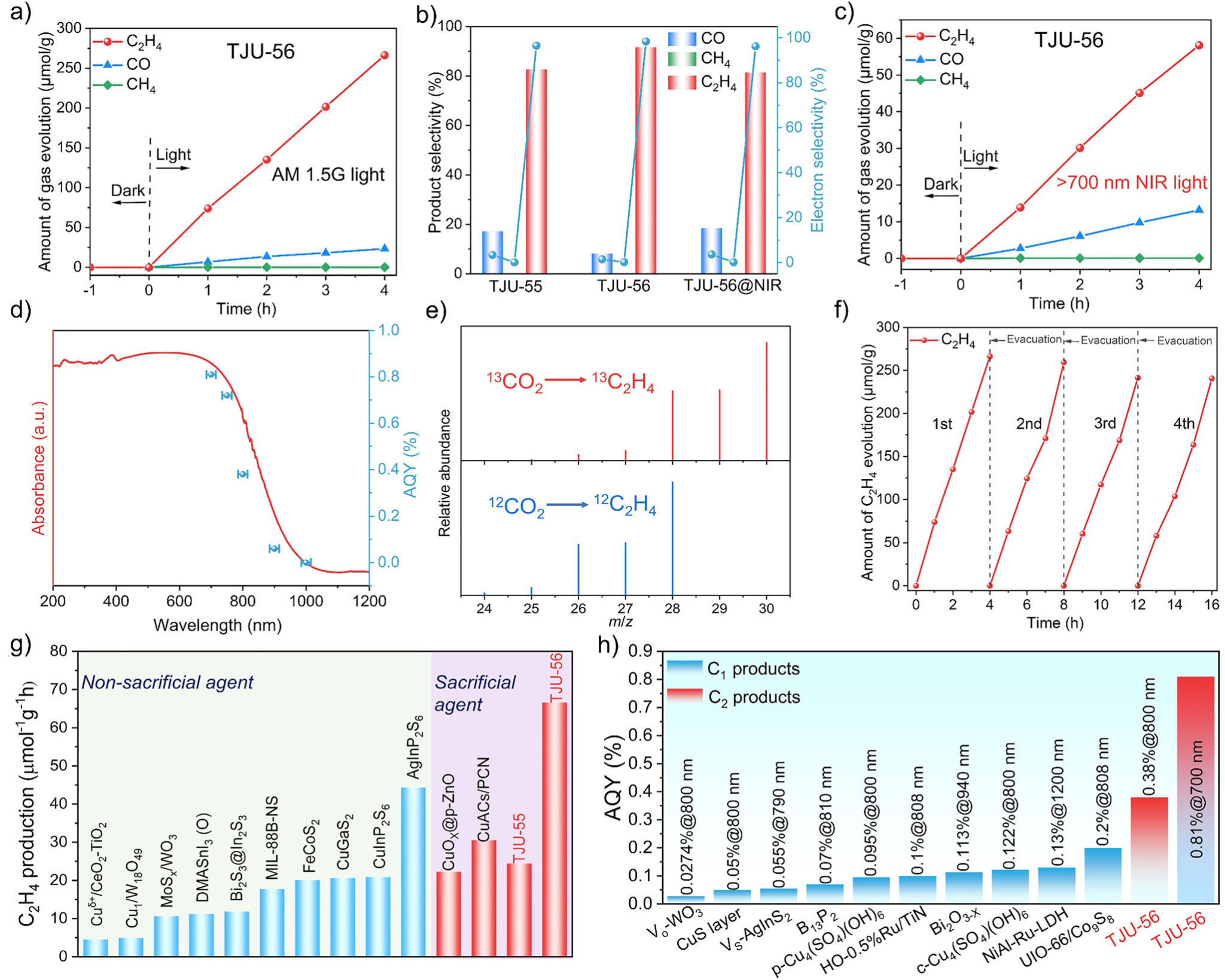 光催化CO2还原的实验结果显示,在模拟太阳光下,紫精修饰的层状碘化铅可高选择性光催化CO2 还原至C2H4产物,产率达66.59 μmol g–1 h–1,对C2H4的电子选择性高达98.4%,性能位居所有报道光催化剂的前列。更重要的是,在>700 nm的近红外光下,该催化剂的C2H4产率仍达14.52 μmol g–1 h–1,且在700 nm和800 nm处的表观量子效率(AQE)分别达到0.81% 和 0.38%,其性能超越了绝大部分近红外光催化剂。13CO2同位素标记实验以及对照实验证实了C2H4产物碳源完全来自CO2。连续循环测试显示催化剂性能稳定,展现了良好的实际应用前景。
