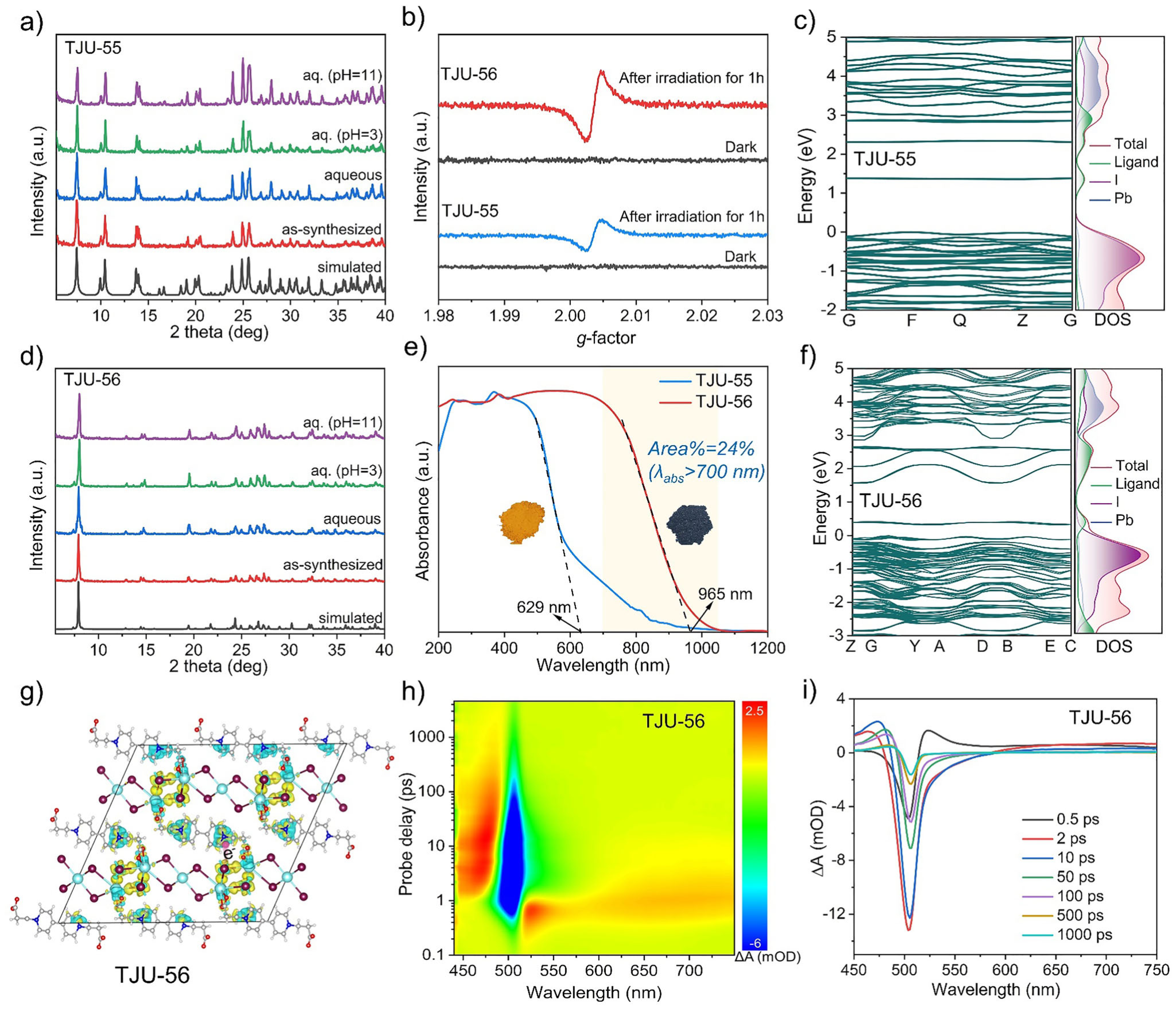 通过采用相同紫精配体和精准调控合成条件,本研究成功实现了紫精基卤化铅从基于一维Pb4I8链状结构到二维Pb3I6层状结构的维度工程。在二维结构中,紫精配体作为层间支柱,采取平行堆叠模式,使得相邻的氮活性位点距离缩短至约4.7 Å,为后续C–C偶联提供了有利的空间环境。稳定性测试表明,紫精修饰的一维和二维卤化铅均表现出优异的结构稳定性,EPR测试证实了二维结构能更有效地产生并稳定氮自由基。紫外-可见漫反射光谱显示该材料的吸收边成功延伸至965 nm近红外光吸收区,带隙窄至1.28 eV,且其能带结构在热力学上满足CO2还原半反应的要求。结合DFT计算、原位XPS及飞秒瞬态吸收光谱分析发现,在光照条件下,电子从富电子碘化铅层迅速转移至缺电子的紫精单元,从而实现高效的分子内光诱导电子转移过程。