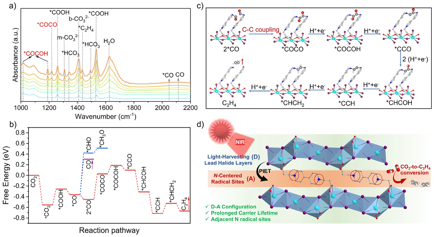 采用原位漫反射红外傅里叶变换光谱(in situ DRIFTS)对光催化CO2还原过程中产生的中间体进行追踪,成功观测到位于1218 cm-1的关键中间体*CO–CO的特征峰,为C–C偶联的发生提供了直接实验证据。DFT反应自由能计算表明,在紫精修饰的二维层状结构中,两个CO中间体偶联形成CO–CO的能垒仅为0.479 eV,远低于生成CHO或直接脱附为CO的路径,从而在热力学上显著促进了C2产物的高选择性生成。该过程得益于材料独特的D–A结构,不仅确保了光生载流子的高效积累,其紧密靠近的相邻紫精氮自由基更为C–C偶联提供了空间活性位点,二者协同作用共同促成了高效、高选择性的近红外光催化过程。