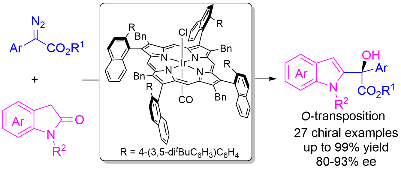本研究首次实现了铱卟啉催化的氧化吲哚与芳基重氮酯不对称重排反应,为手性2-吲哚叔醇的合成提供了高效方法。该策略通过精准控制羰基叶立德形成与重排过程,突破了传统吲哚C2功能化的限制,为复杂手性吲哚骨架的构建开辟了新途径,在药物化学中具有重要应用前景。