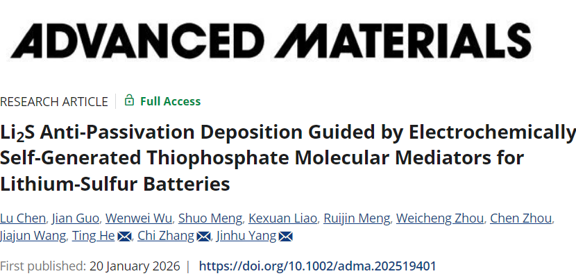 锂硫电池因其超高理论能量密度(约2600 Wh kg⁻¹)和硫元素的资源优势,被认为是下一代高能量密度储能体系的重要候选。然而在实际应用中,由于可溶性多硫化物的穿梭效应会以及最终放电产物 Li2S 的钝化问题,其性能始终难以突破。针对上述问题,我院贺婷/杨金虎教授课题组联合张弛院士团队,提出了一种全新的解决思路:通过电化学过程原位生成分子级介体Li3PS4分子,引导Li2S以高活性结构沉积形成由Li3PS4@Li2S分子簇构成的三维多孔沉积膜,从根本上避免钝化。相关成果以“Li2S Anti-Passivation Deposition Guided by Electrochemically Self-Generated Thiophosphate Molecular Mediators for Lithium-Sulfur Batteries”为题,近日在线发表于《先进材料》。