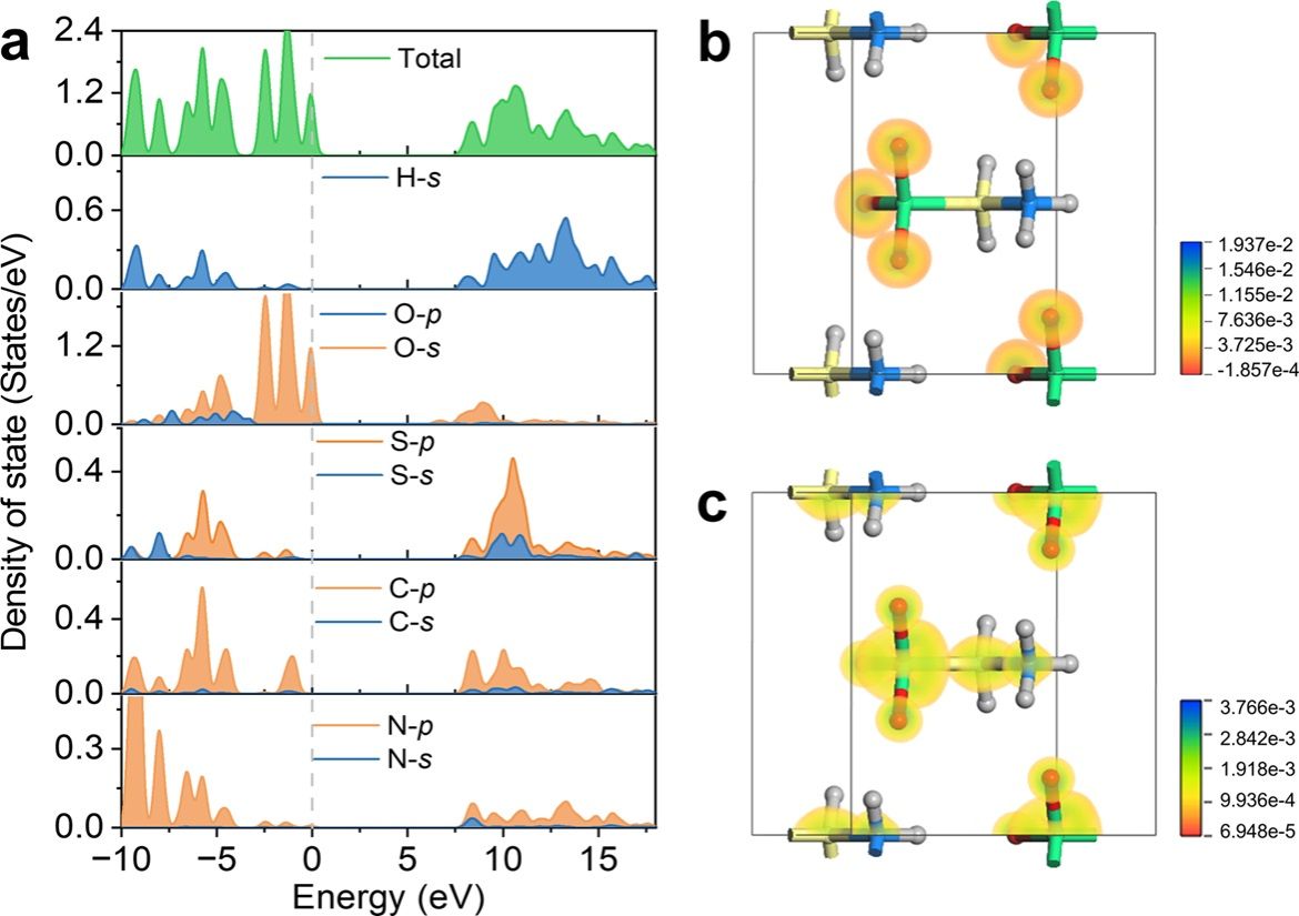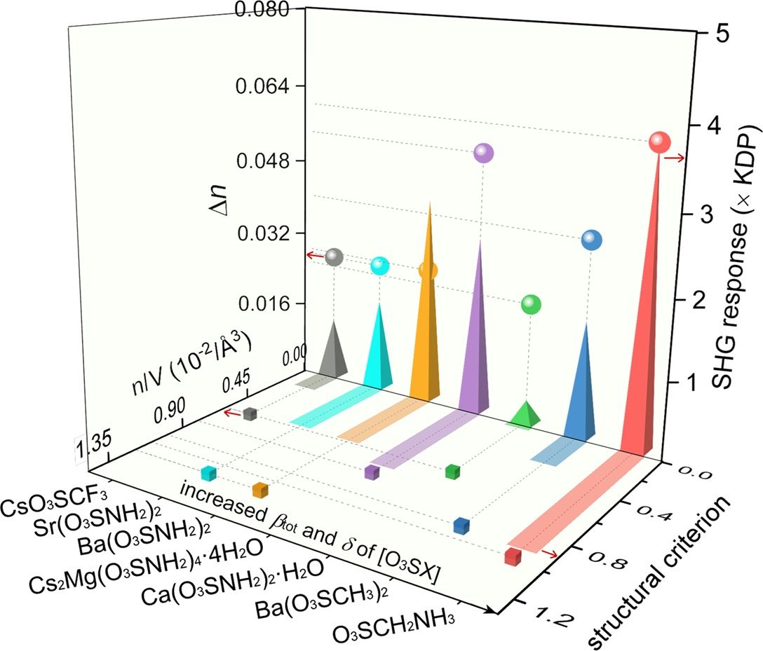 研究团队进一步运用第一性原理计算等理论手段,揭示了性能优化的内在机制:[O3SCH2NH3]基元具有更大的分子尺寸,其[SO3]和[NH3]单元均展现出弥散的电子云分布,使其易被极化。此外,相邻[O3SCH2NH3]基元间的氢键和静电相互作用增强了晶体的整体极性。这种增强作用,结合[O3SCH2NH3]基元的一致对齐排列,导致晶体结构内的诱导偶极矩显著增大,从而造就了O3SCH2NH3晶体强的光学倍频响应。