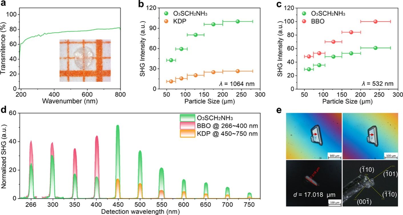 O3SCH2NH3晶体在深紫外非线性光学性能方面实现了重要突破,展现出卓越的综合光学性能,多项指标达到领先水平:实验测得吸收边<170 nm (对应带隙 > 6.53 eV),理论计算带隙7.80 eV,透光范围覆盖整个深紫外区域,满足实际应用需求;同时具有强的粉末倍频效应(0.7 × BBO @ 532 nm和3.8 × KDP @ 1064 nm)、充足的双折射(