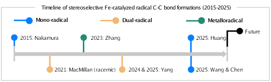文章围绕三类新兴机理模式展开,包括单自由基路径、双自由基路径和金属自由基路径,重点总结了铁催化体系在交叉偶联、自由基加成、自由基-极性交叉以及环丙烷化等反应中的代表性进展。作者系统分析了不同催化体系在自由基生成、交叉选择性控制及立体诱导方面的特点,并对近年来铁催化不对称自由基碳—碳键形成反应中的关键突破进行了总结。
