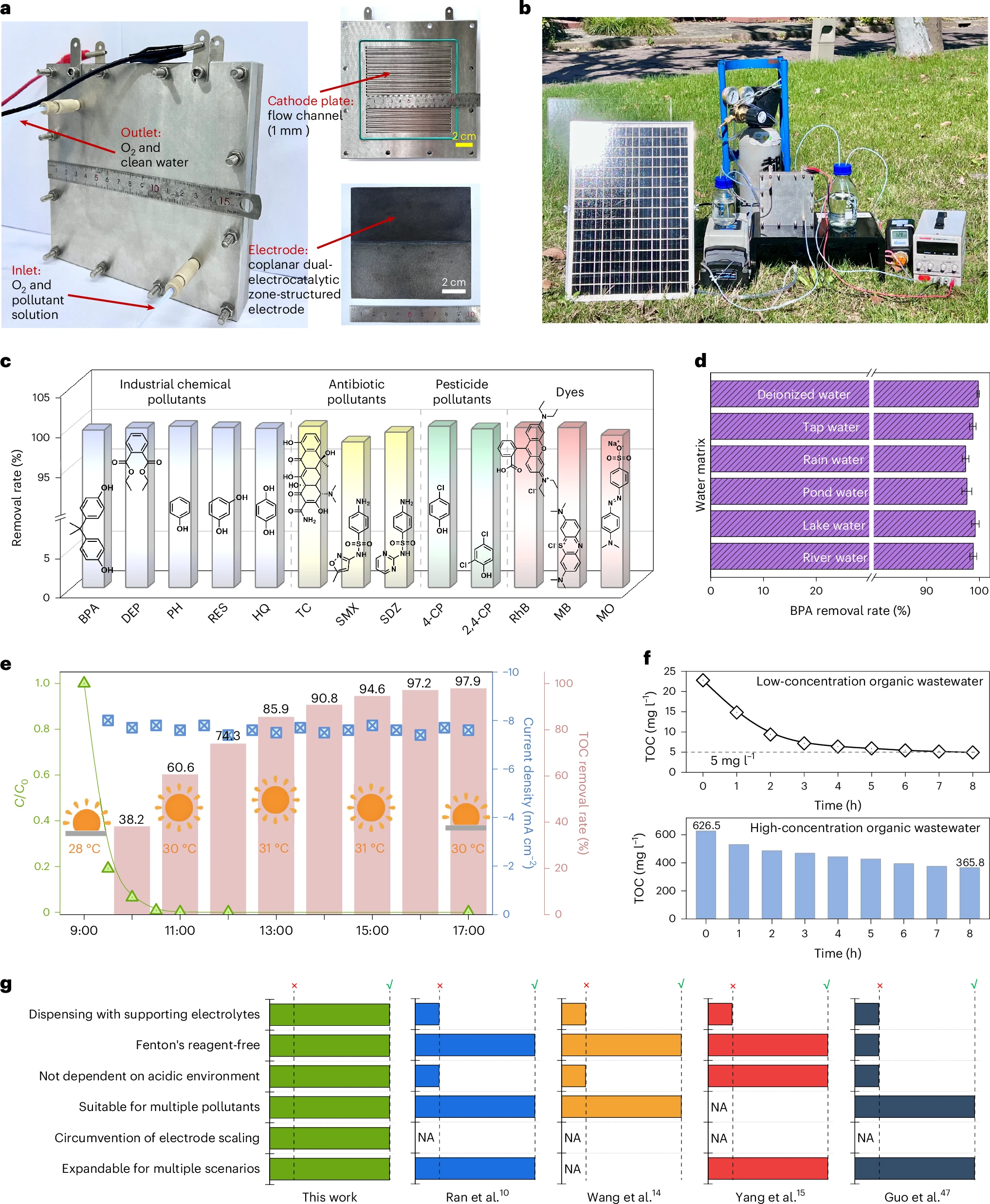图6展示了太阳能驱动的放大规模共面双电催化区域耦合系统在实际应用中的处理能力。该系统对工业化学品、抗生素、农药和染料四类典型难降解有机污染物的去除率均保持在较高水平,验证了其广谱适用性。在五种不同实际水体(如自来水、雨水、湖水等)中,BPA的去除率均超过96%,表明系统对复杂水体基质具有良好的耐受性。在8小时的连续运行中,系统对BPA的总有机碳去除率达到98%,实现了深度矿化。在处理实际化学制药废水时,系统对原水和预处理出水的TOC去除率分别达到42%和78%,且电极表面无明显结垢现象。与现有主流技术相比,该系统在无电解质、无芬顿试剂、无pH调节、多污染物适用性、抗结垢和多场景适用性等六个关键维度上均表现优异,展现出作为新一代绿色水处理技术的巨大潜力。