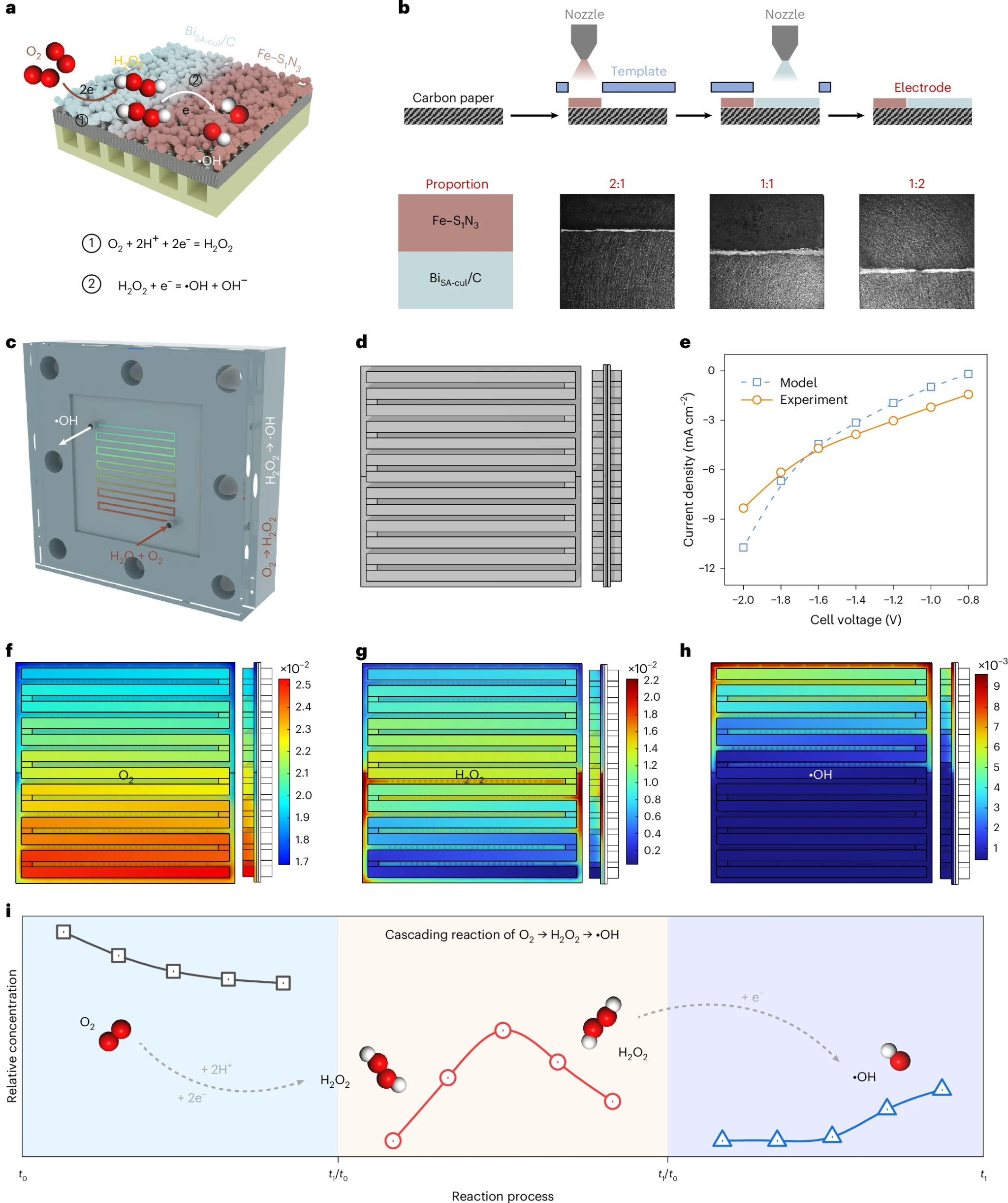 图4通过有限元模拟揭示了共面双电催化区域耦合系统内的反应与传质过程。结果显示,氧气在流经第一电催化区域时被迅速消耗,用于生成H2O2;H2O2的浓度分布呈现出从第一区末端向第二区域入口连续梯度的特征,表明其通过对流传输至第二电催化区域。在第二区域内,H2O2浓度逐渐下降,说明其被进一步活化生成•OH,且浓度沿流动方向逐渐升高,表明该区域是•OH的主要来源。该研究从理论上证实了该系统能够在无支持电解质条件下实现O2 → H2O2 → •OH的级联转化,为后续实验提供了坚实的理论依据。