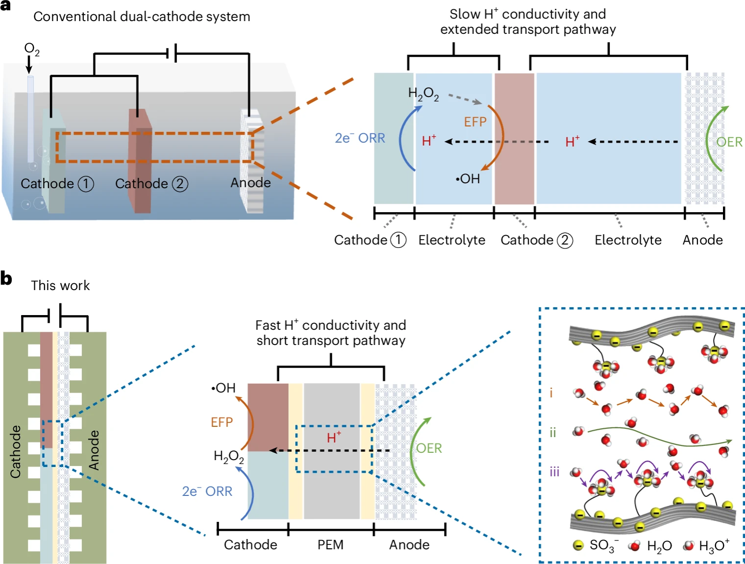 图1展示了两种电化学反应器构型的对比。图a为传统的双阴极电芬顿系统,两个阴极均浸没在液相反应器中,电极间距较大,质子(H+)传质路径长,导致反应动力学受限,且高度依赖外加支持电解质以维持导电性。图b为本研究提出的共面双电催化区域耦合系统,该系统与膜电极组件集成,形成零间距反应环境,显著缩短了传质路径并降低了欧姆损耗。通过将两个电催化区共面设计在同一电极层上,实现了反应物(O2)和中间产物(H2O2)的空间连续性转化,最终高效生成•OH。该构型不仅消除了对支持电解质的依赖,还通过优化传质效率显著提升了整体反应性能,为无电解质电化学水处理提供了新的设计思路。