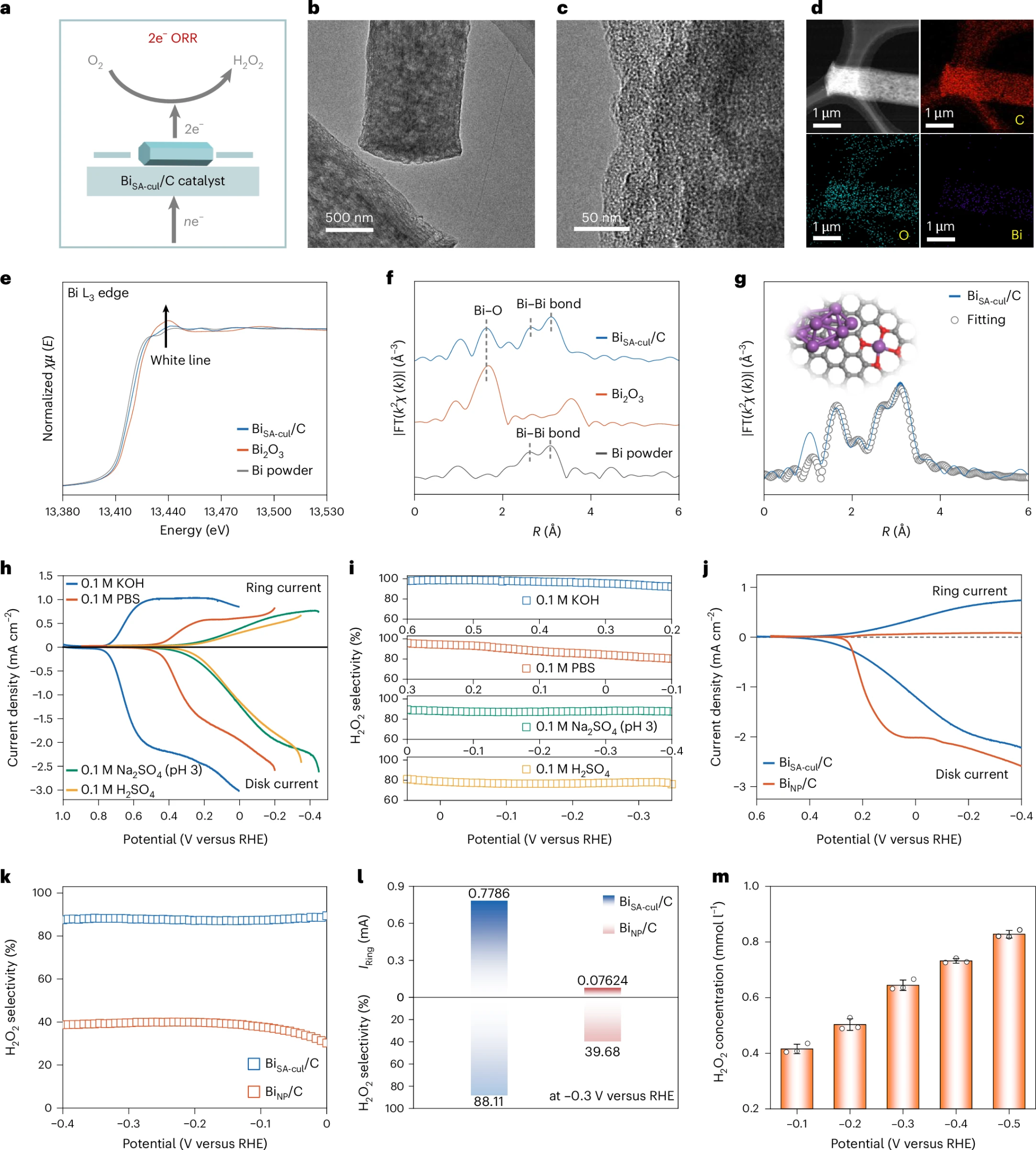 图2 第一电催化区域催化剂的表征与电化学性能:证实了BiSA-cul/C催化剂的结构特征和其高效、广谱的产H2O2的能力。