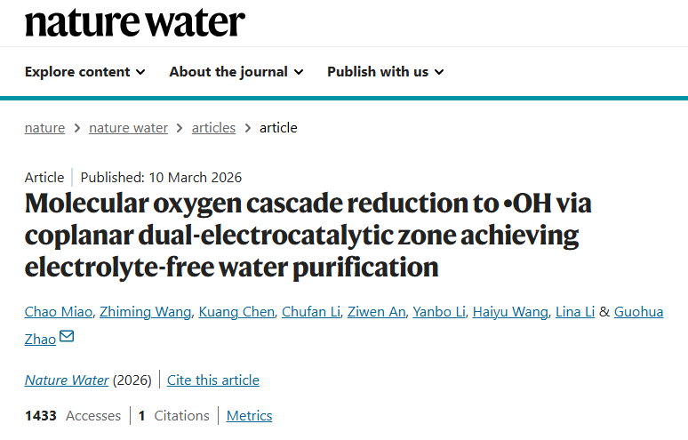标题:Molecular oxygen cascade reduction to •OH via coplanar dual-electrocatalytic zone achieving electrolyte-free water purification