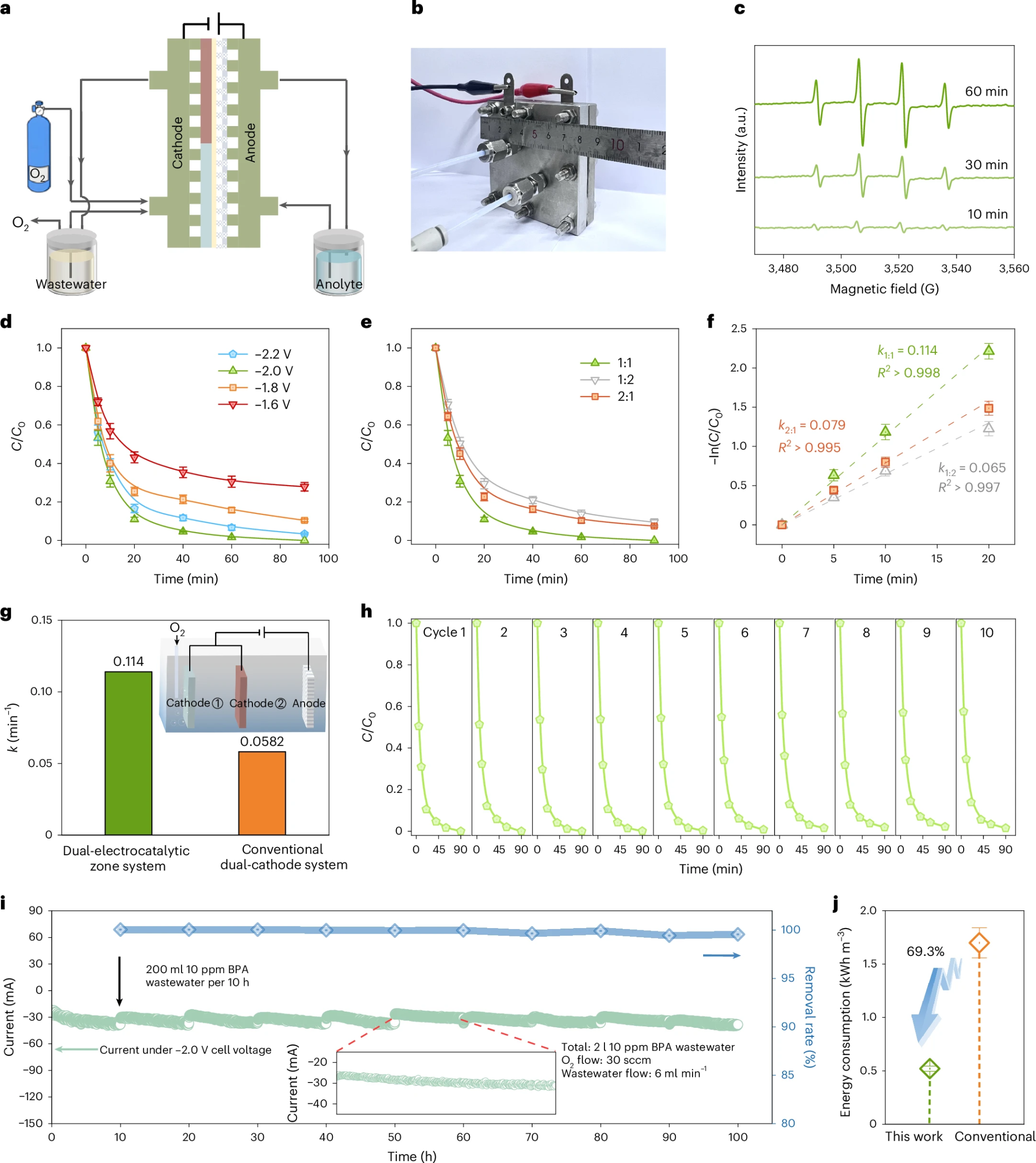 图5评估了实验室规模下共面双电催化区域耦合系统对双酚A(BPA)的降解性能及稳定性。EPR测试表明,系统运行10分钟内即可检测到明显的•OH特征峰,且信号强度随时间增强,证明其具备持续高效的•OH生成能力。在电极面积比为1:1、电压为-2.0 V的条件下,系统在90 min内实现了BPA的完全降解,且降解速率常数(0.114 min-1)是传统双阴极系统(0.0582 min-1)的近两倍。循环实验显示,经过10次连续运行,降解效率波动小于3%;100小时长期运行中电流保持稳定,表明系统具有良好的稳定性;能耗对比显示,本系统相比传统双阴极系统能耗降低了69.3%。相关结果充分证明了该系统在无电解质条件下的高效性与经济性。