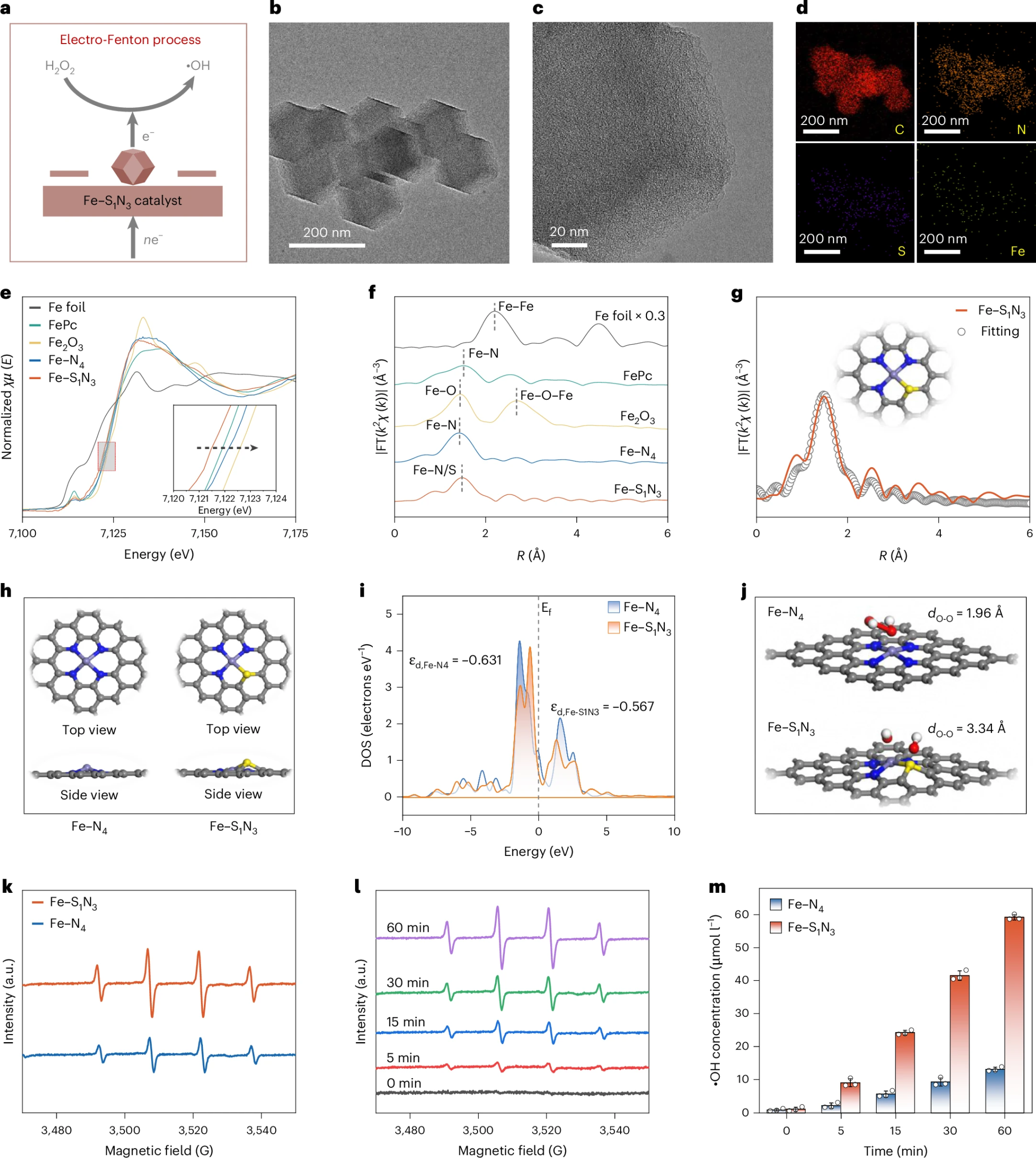 图3 第二电催化区域催化剂的表征与电化学性能:揭示了Fe–S1N3催化剂的原子结构及其高效活化H2O2产•OH的能力。