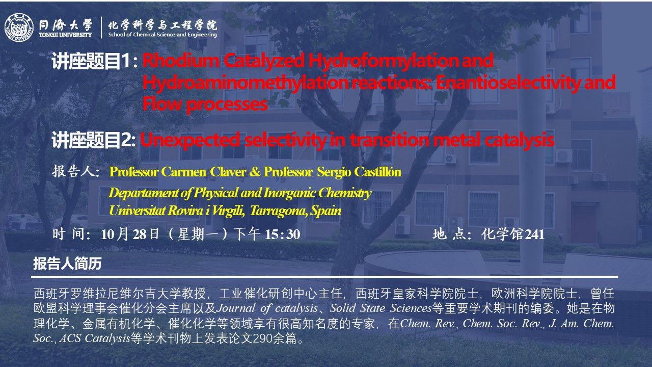 报告人1:  Professor Carmen Claver (Departament of Physical and Inorganic ChemistryUniversitat Rovira i Virgili,Tarragona, Spain)