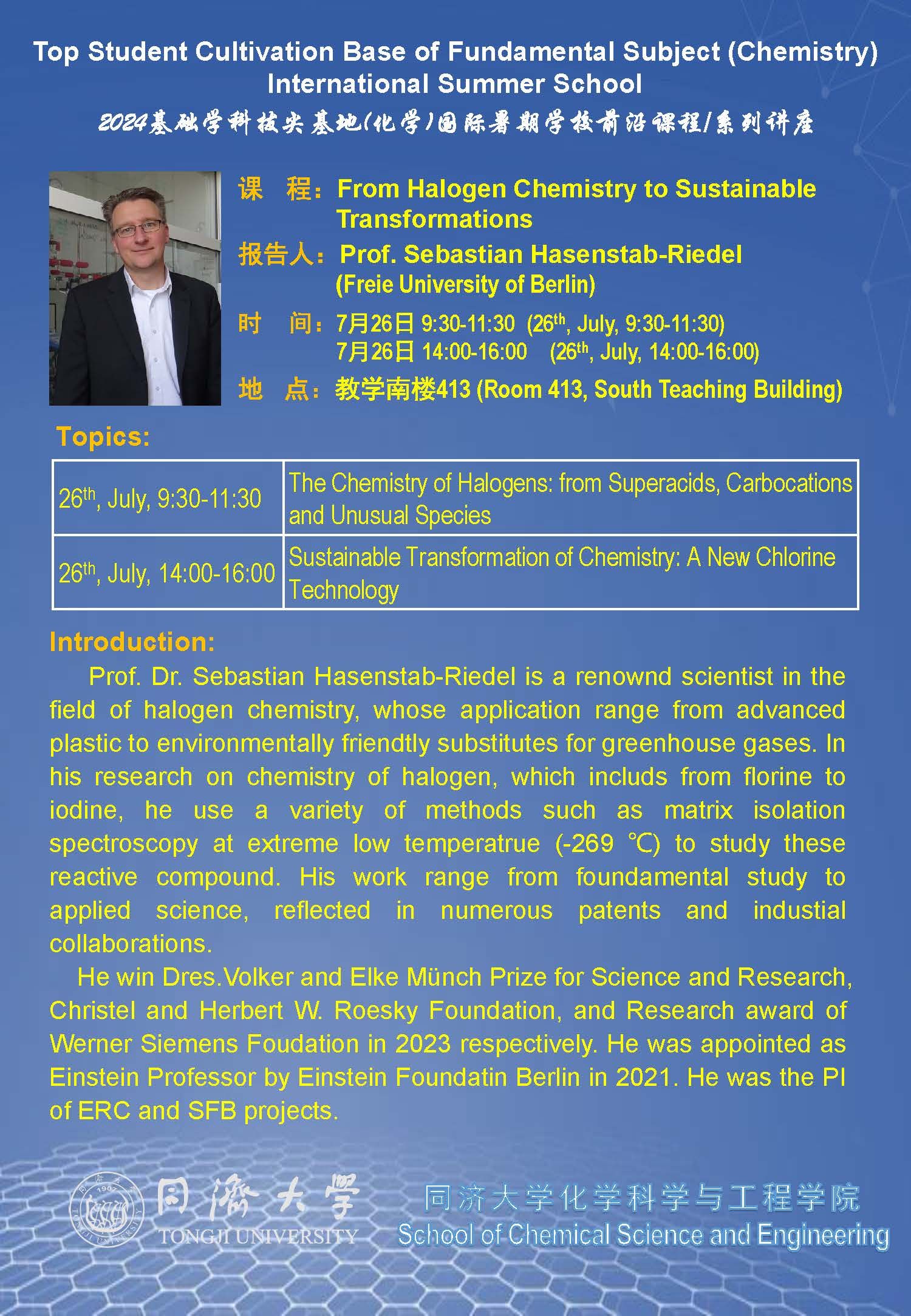 (2024年7月26日) Prof Sebastian Hasenstab Riedel: From Halogen Chemistry to Sustainable Transformations