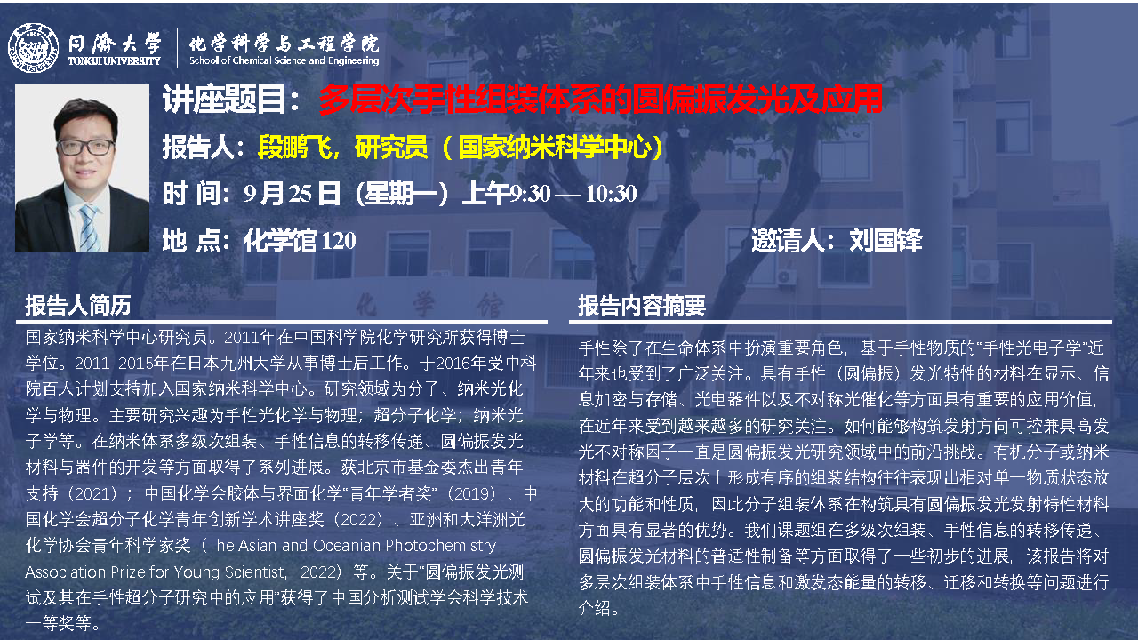 (9月25日)段鹏飞研究员:多层次手性组装体系的圆偏振发光及应用