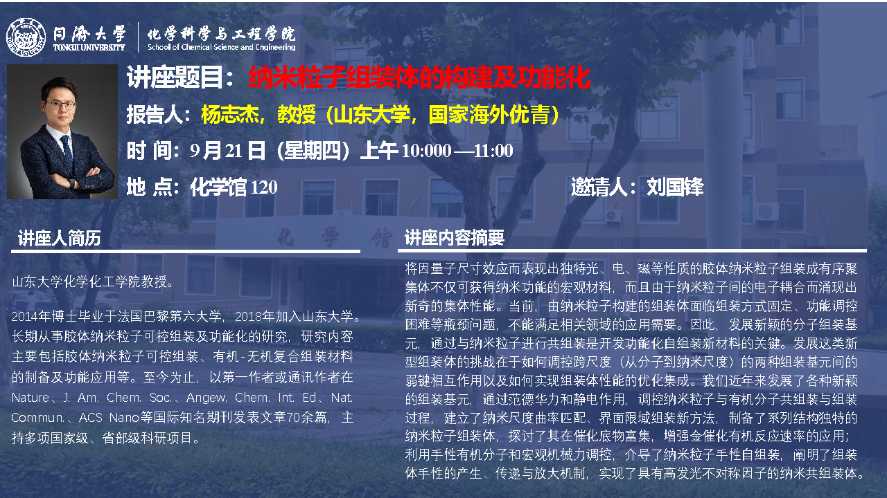 (9月21日)杨志杰教授:纳米粒子组装体的构建及功能化