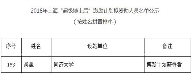 我院博士后吴超入选2018年上海“超级博士后”激励计划
