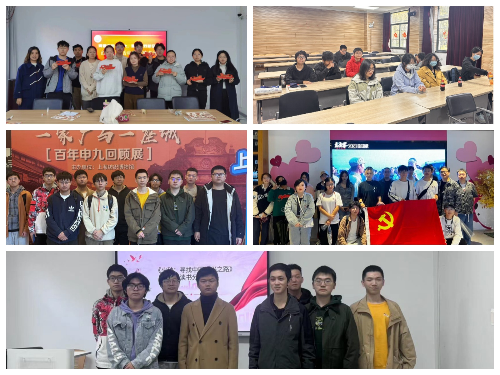 各小组分享了各自活动开展情况。李有梅、张婀茭小组进行了红船手工制作及红船精神分享活动,然后前往了中共上海地下组织斗争史暨刘长胜故居、中共中央军委机关旧址、中国劳动组合书记部旧址陈列馆和1920年毛泽东寓所旧址进行参观学习。在参观学习中同学们都获益良多。林伟宁、马越小组组织了《火种:寻找中国复兴之路》一书的读书分享。在红色景点打卡活动中,小组成员集中前往中共一大会址、团中央机关旧址、纺织博物馆和顾正红纪念馆进行参观学习。最后,为了提高小组成员综合素质, 11月下旬组织了晨跑、夜跑各一次,科学地组织了跑前热身和跑后拉伸,保证了锻炼的效果。全星蕾、陈薇小组开展了红色经典书籍分享会。同学们积极分享了自己选取的一本书或一部电影,更深刻地了解了中国近现代革命历史和那些为国家和人民英勇奋斗的先烈们。每个分享都呈现了不同侧面的英雄事迹和革命精神,这次分享让同学们更加铭记历史,珍视今天的幸福生活。杨骁、夏辉康小组策划了《志愿军》红色观影活动及红色种子打卡盖章活动。在观影活动中同学们被志愿军的爱国主义精神以及不怕牺牲的精神所感动,纷纷表示要学习并发扬这种精神。通过打卡盖章活动,鼓励同学们传承红色精神,争做时代新人。卞佳林、朱馨怡小组和杨骁、夏辉康小组共同策划组织了《志愿军》的观影活动。此次观影活动增强了成员的爱国精神,也坚定了小组成员报效国家的信念。小组成员分别前往了邮政博物馆、曹禺故居纪念馆和梁启超故居等处参观学习,了解了邮政发展对于红色文化传播的重要意义,并重温了伟人的光辉事迹,深刻树立榜样模范意识。