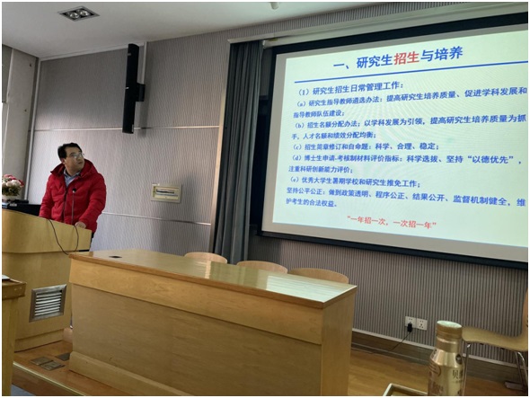 副院长刘明贤从研究生招生与培养、科研工作、实验室安全三个方面总结汇报了自2017年11月任现职以来的主要工作,以及学院在科学研究方面所取得的重要成果。2016年至今,学院师生在五个“化学+”交叉领域发表高水平论文1127篇,其中包括在化学、材料顶级期刊发表的51篇具有国际影响力的成果。学院教师主持的国家级科研项目累计达73项,其中重点项目3项、国家杰青1项、国家优青3项,获批国家重点研发计划子课题7项,科研经费到款数10307.38万元。学院成立以后还实现了省部级科研奖项的突破。