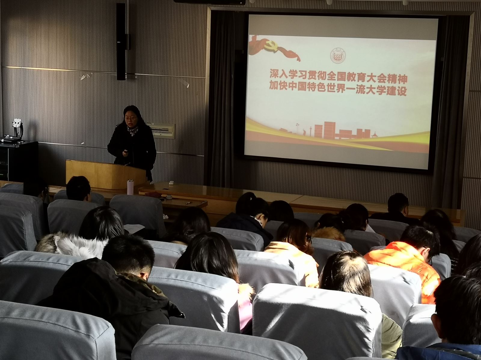 12月18日下午,全院教师党员大会在化学馆举行,学院党委副书记(主持工作)杨晓杰为大家讲专题党课,主题为《深入学习贯彻全国教育大会精神 加快中国特色世界一流大学建设》。