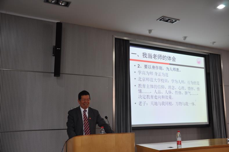 李老师总结自己数十年的从教经历,向在座的师生谈了几点做老师的体会:人要有崇高的理想和坚定的信念,理想是人生的发动机,信仰是人生的方向盘;做老师要以身作则,为人师表;做老师要有扎实的理论功底和较为广博的知识,要掌握行之有效的学习方法;做老师要了解学生;做老师要保持阳光心态;做老师要提升语言表达力,练就大众“化”理论的本领;做老师要养成自己的讲课风格;做老师还要游刃有余地驾驭课堂。李老师还围绕“如何教育人”这个问题,从受教育者的权益和体验,讲求实效,尊重人、理解人、关心人,因材施教,坚持公开公正,大教育观,大时间观,大空间观,大系统观,工作同步、责任同负和全员育人等方面结合教学设计和教育过程深入浅出地与师生交流。
