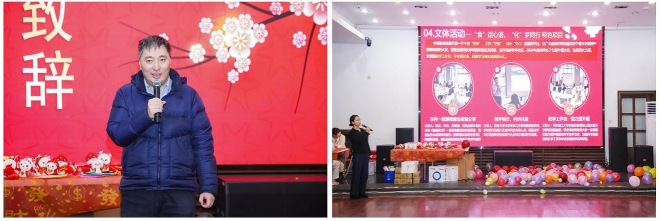 活动正式开始,由学院党委书记曹同成老师致开幕词。曹老师回顾了学院在学科建设、立德树人等方面取得的喜人成绩,并提前祝愿学院师生新春快乐,阖家幸福。随后,党委副书记赵红颖老师向大家汇报了2024年度学院工会的主要工作和取得的成绩,感谢全体教职工的热切关注和大力支持。