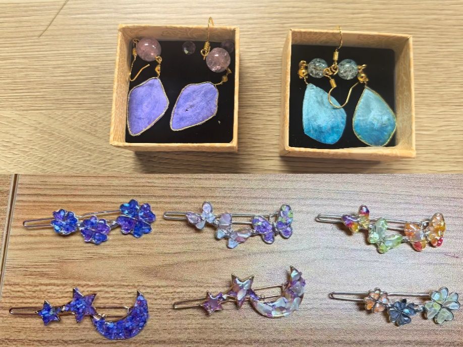 在螺钿发夹制作区,老师们在指导下将一片片色泽绚丽的贝壳薄片,经过精心镶嵌,巧妙地固定在发夹底座上。大家将自然之美与匠心独运相结合,创作出一件件独一无二、流光溢彩的螺钿饰品。在绒花耳饰制作区,五彩的蚕丝绒线在老师们的指尖缠绕,逐渐变成寓意吉祥的绒花作品,传递着对美好生活的祝福与期许。